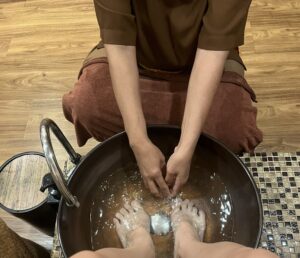 こちらを記入後先にお会計となります。ドリンクを飲み終えるとセラピストの方が来てくださり、まずは温かいお湯と良い香りのする石鹸で足を洗ってくれました。(セラピストの方は、簡単な日本語で会話ができました)