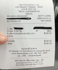 「日本に書類を送りたい」と伝えるだけで、担当の方が封筒の重さなどをはかって手続きをしてくれます。追跡が必要か聞かれたため、念のためお願い(=書留郵便を利用)しました。料金は230バーツでした。