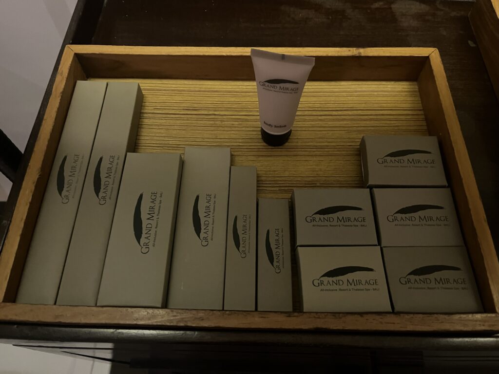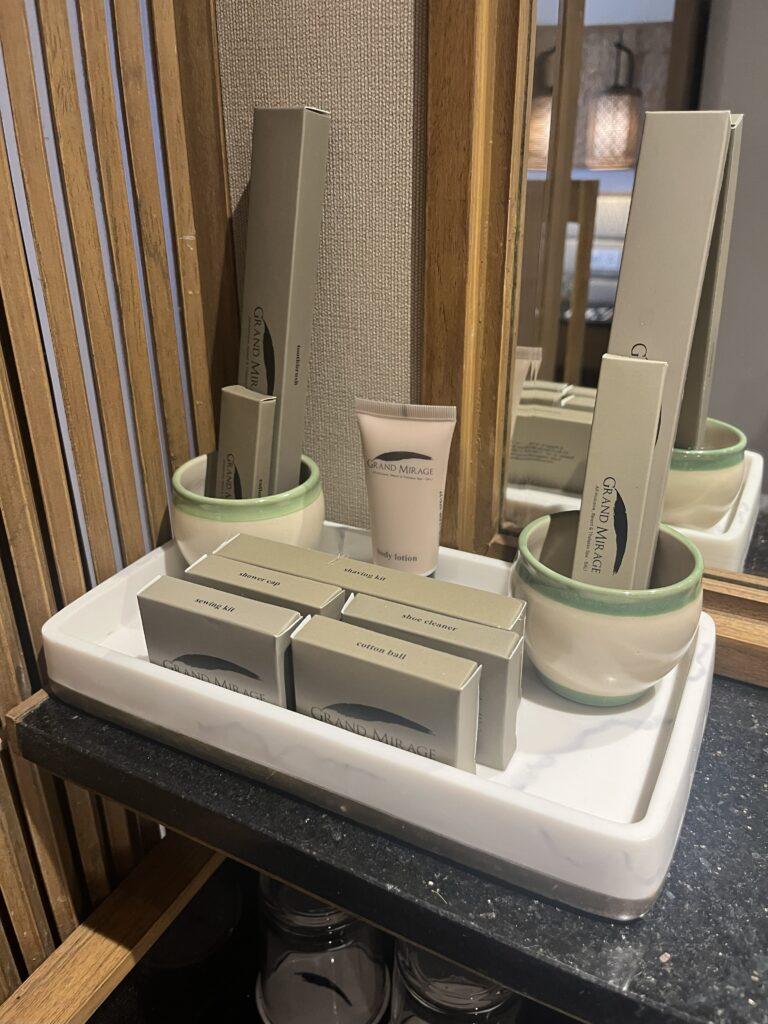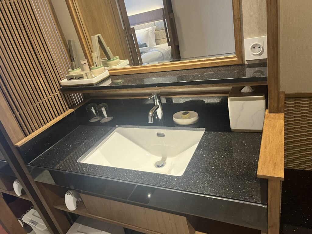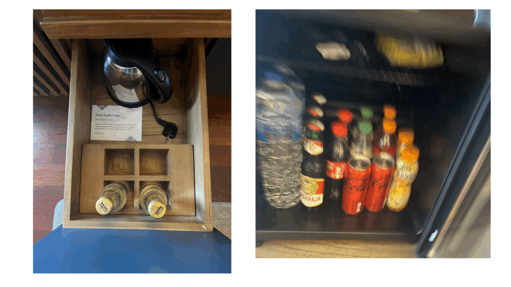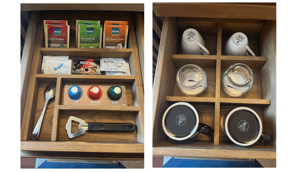スイートルーム、プレミアオーシャンビュールーム共通ですが、いずれも、金庫(スイートルームのほうが古いタイプ)、冷蔵庫(庫内に有料ドリンク)、コーヒー紅茶、ハンガー、ハンガー掛けはありました。以下写真はプレミアオーシャンビュールームのものとなります。