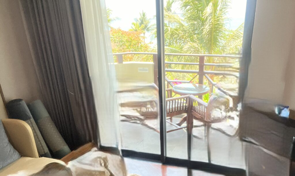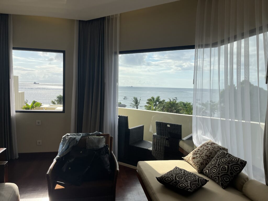 翌朝、カーテンを開けてみると、目の前に広がるオーシャンビュー。バルコニーには椅子も置いてあり、海を眺めてボーっとすることもできます。