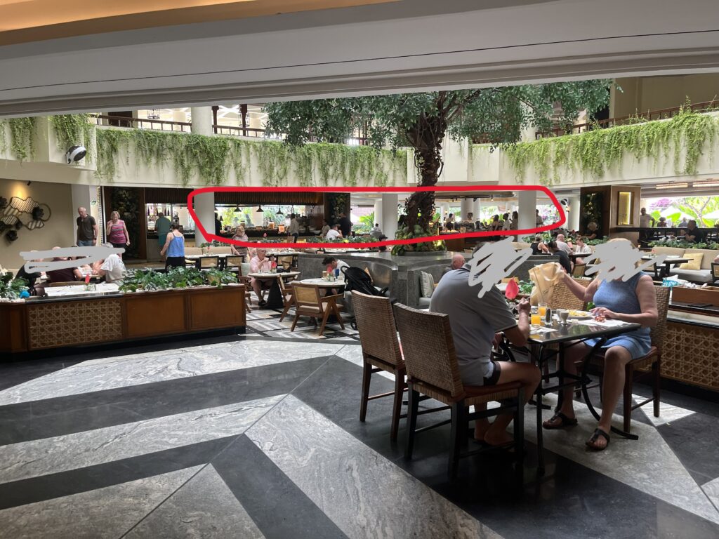今回は朝食付きのプランにしました。朝食は1FのGrand Cafe。オープンエアな空間で優雅な時間が流れます。写真の赤で囲っている部分、写真の右手、撮影している場所の背面奥側と大きく3か所に分けれてお料理が設置してありました。