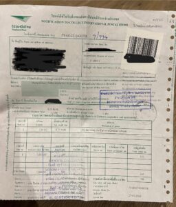 タイ側で荷物が到着したあと、郵便局(Thailand Post)からこのような税関通知書が届きました。1箱に対して1通のため、2通来ていました。